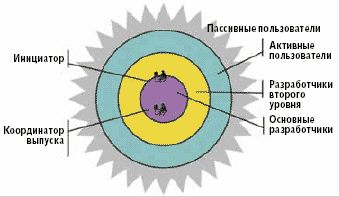 Образное название «Собор и базар» в большей мере характеризует добровольный способ формирования хакерского сообщества, мотивацию участников, но не складывающуюся в итоге инфраструктуру разработки. Результатом и «базарной», и «кафедральной» процедур формирования коллектива с абсолютной неизбежностью должна стать некая дееспособная организационная структура. В этом две противоположности сходятся, и очевидно, что при исключительно стихийном взаимодействии какая-либо реальная работа не может быть выполнена. Поэтому коллаборативная деятельность предполагает определенную, пусть добровольную, но все же иерархию участников проекта, неизбежность выделения лидеров по объективным показателям.