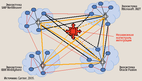 Пользователей привлекают выгоды таких «экосистем», в том числе общие стандарты, встроенные средства интеграции и унифицированные инструменты безопасности и управления. Однако «экосистема» ведет к замыканию пользователей на технологии одного поставщика. Сознательно или случайно, большинство предприятий приходят к использованию в своих ИТ-средах технологий из «экосистем» нескольких поставщиков. Каждая «экосистема» применяет собственные технологии интеграции, репозиторий метаданных, политики управления и безопасности. Лишь немногие потребители способны пробраться сквозь этот лабиринт и осознать, что различные области «экосистемы» требуют наличия посредника, который оптимизирует их взаимодействие и установит непротиворечивую корпоративную политику (рис. 11).