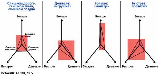 Высшее руководство предприятий зачастую формулирует свои требования к ИТ в самых общих чертах, основываясь частью на точной информации, а частью — на необоснованных представлениях. В результате ИТ-отделы изо всех сил пытаются выполнить нереалистичные требования, чтобы обеспечить новые услуги в большем объеме, быстрее и дешевле. Большинство новых систем вводятся в строй с опозданием, оказываясь слишком дорогими и функционально неполноценными. Однако простым усилием воли невозможно одновременно реализовать все три желаемых аспекта проекта (рис. 2): улучшение одного из них неизбежно ведет к ухудшению двух других.