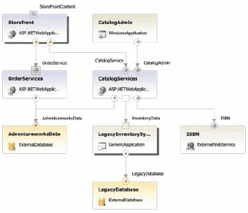 Создание логической структуры решения и его развертывания. В составе редакции VSTA поставляются инструменты для архитектора, позволяющие создавать три типа диаграмм: архитектура компонентов решения Application Diagram (рис. 3); инфраструктура развертывания Logical Datacenter Diagram; описание размещения компонентов на серверах инфраструктуры Deployment Diagram. На данном этапе архитектор создает диаграмму сервисов, составляющих решение, и связей между ними. Для описания архитектуры используются крупные блоки, такие как база данных, настольное приложение, Web-приложение или Web-сервис. Кроме того, архитектор описывает условия работы будущего приложения, например требования к версии операционной системы.
