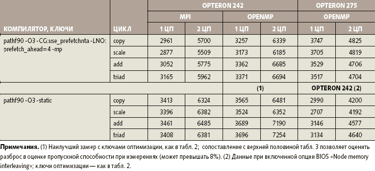 Сопоставление разных процессоров Opteron на тестах STREAM