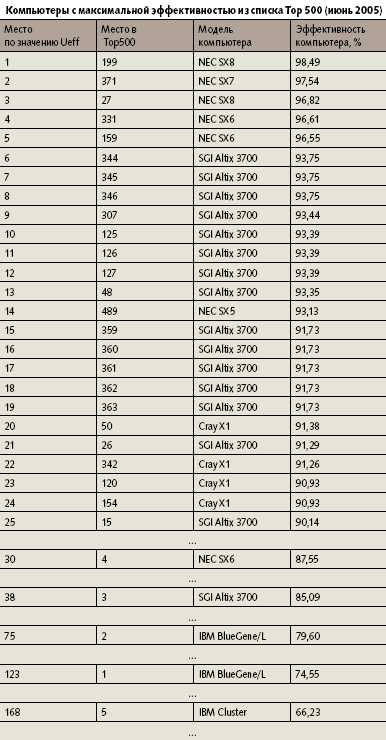 | Таблица 1. Компьютеры с максимальной эффективностью из списка Top 500 (июнь 2005) |