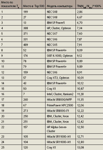 Первые два места по скорости роста производительности занимают новые модели векторных компьютеров NEC. Примечательно, что система NEC SX8 Метеорологического офиса Великобритании, занявшая первое место по эффективности (см. табл. 1), установила рекорд и по показателю TN. В самом деле, в задаче размером 10 240 (Nhalf), а это лишь 2,86% от значения 358 400 (Nmax), 128-процессорный NEC SX8 уже разгоняется до половины максимальной производительности!