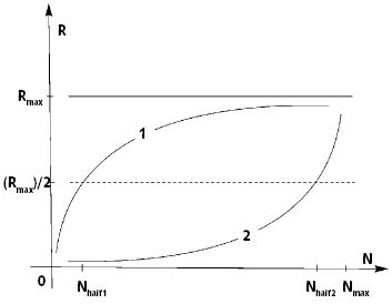 Предположим, что для некоторого компьютера значение TN1 достаточно мало. Это означает, что уже при относительно небольшом размере задачи Nhalf1 производительность компьютера достигает половины максимального значения (см. рисунок). Такой компьютер быстро набирает «скорость», и значительная доля задач с размерами от Nhalf1 до Nmax выполняется с высокой производительностью. Цифрой 1 на рисунке обозначен примерный график роста производительности R такого компьютера в зависимости от размера задачи N.