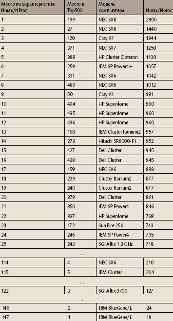 Отсортируем Top500 по характеристике Nmax/NProc (табл. 3). Первые два места заняли векторные компьютеры NEC, причем система NEC SX8 традиционно лидирует с большим отрывом. В первую десятку вошли 7 векторных машин. Если бы по компьютерам Cray X1E в Top500 были представлены данные Nmax, то скалярным машинам в первой десятке пришлось бы совсем туго. Из пятерки лидеров исходного Top500 выше всех поднялся NEC Earth Simulator, а обладатели максимальных значений Rmax заняли последнее и предпоследнее места (значение Nmax представлено для 147 компьютеров из Top500). Надо сказать, что IBM BlueGene/L с данной характеристикой вообще не дружит — из 25 последних мест полного варианта данной таблицы 16 заняли именно эти компьютеры.