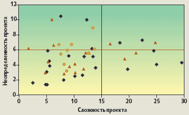 | Рис. 1. Соотношение между сложностью и неопределенностью в проектах трех подразделений. Подразделения представлены маркерами разной формы |
