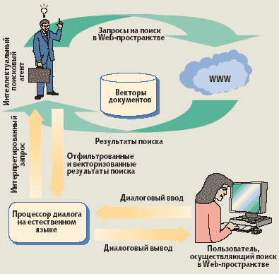 | Поисковый агент с управлением на естественном языке. В процессе диалога пользователь формулирует запросы, которые передаются для обработки в процессор диалога. В ходе взаимодействия с пользователем процессор диалога уточняет запросы и направляет их поисковому агенту |