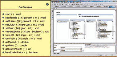 Автомобиль является ярким примером определения сервиса. Все автомобили имеют одинаковые базовые возможности, и их обеспечение определяется вопросами «Что они должны делать?» и «Как заставить их это делать?». Если ограничиться рассмотрением автомобилей без автоматической коробки передач, то в терминах пользовательского интерфейса к сервису получатся почти идентичные спецификации. На рис. 4 показаны два представления одной и той же информации. Справа — простая диаграмма класса UML, а слева — визуализация данного класса в виде Web-сервиса. На этом рисунке в упрощенном виде показаны основные функции автомобиля, необходимые пользователю.