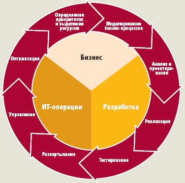 В представлении IBM, жизненный цикл разработки вместе с руководством таким циклом и деятельностью оперативной службы — это замкнутый цикл, в котором к традиционным этапам разработки добавляются бизнес-анализ программных проектов и эксплуатация готового программного продукта (рис.2). Этот цикл в IBM называют процессом разработки, определяемым бизнесом (business-driven development, BDD). Для воплощения в жизнь полной автоматизированной поддержки BDD компании предстоит решить все проблемы интеграции средств разработки — и между собой, и, что особенно важно, с другими программными семействами (WebSphere для моделирования и управления бизнес-процессом разработки, Lotus для оптимизации коллективной работы в распределенных командах, Tivoli для связи разработки и эксплуатации).