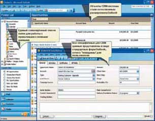 Мало того, выяснилось, что действительно неудобно набирать данные в «голых» HTML-формах, пусть и улучшенных разработчиками Salesforce.com. Именно поэтому более продвинутые Web-клиенты других CRM-систем (Siebel, Pivotal) требуют загрузки поверх HTML специализированных компонентов Java и ActiveX. В любом случае приходится все время переключаться между Outlook и окном CRM-приложения, чтобы копировать наименования организаций, имена контактных лиц, адреса электронной почты и прочие сведения, не говоря уже о необходимости сохранения писем и документов. Можно, конечно, устанавливать дополнительные компоненты, позволяющие все это делать с помощью расширенных меню и инструментальных панелей, но тогда надо запоминать, где и что появилось и как им пользоваться.
