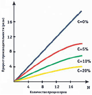 Граничные значения c соответствуют полностью параллельным (c=0) и полностью последовательным (c=1) программам. Если лишь 1/10 часть программы выполняется последовательно, то в принципе невозможно ускорение в десять раз – вне зависимости от числа используемых процессоров (ядер). Важное следствие закона Амдала состоит в том, что максимальный рост производительности (в N раз при N процессорах) недостижим. В противном случае последовательно исполняемая часть программы должна быть равна нулю, что невозможно. Еще одно следствие закона таково: чем меньше доля последовательно исполняемой части программы, тем больше прирост производительности (рис. 1).