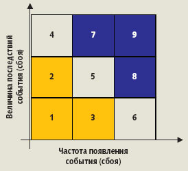 Число и продолжительность внеплановых простоев имеют вероятностную природу, сходную с природой рисков, поэтому в области ИТ управление рисками является одним из требований со стороны пользователей, руководства и владельв бизнеса. В терминах управления риском последний определяется как произведение вероятности (частоты) проявления события (сбоя) и величины его последствий. Возможные комбинаи частоты проявления и величины последствий рисковых случаев удобно представлять в виде матри уровней риска (risk-level matrix). Пример матри 3х3 (по три градаи вероятности и величины последствий) приведен на рис. 2.