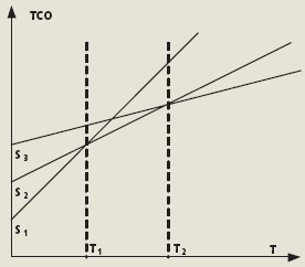 Для коротких сроков службы ИТ-ресурсов предпочтительным представляется решение с наименьшими начальными затратами (вариант S1). Для среднего временного интервала [Т1-Т2] наиболее выгодным является промежуточный вариант с умеренными начальными затратами S2. Однако для временного интервала [Т2-Т2+] вариант с наибольшими начальными затратами S3 оказывается наиболее выгодным ввиду снижения повременных затрат (по сравнению с затратами, характерными для первых двух вариантов).
