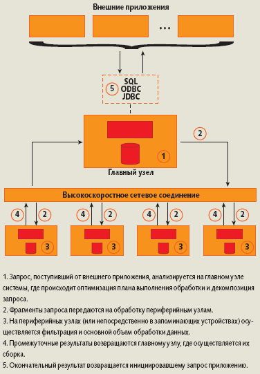 Конструктивно машина хранилища данных представляет собой смонтированную в стойку многопроцессорную систему, состоящую из главного и периферийных узлов. Они имеют процессоры, память, контроллеры, запоминающие устройства, порты ввода/вывода, оснащены полностью настроенными программными средствами и связаны между собой высокоскоростным сетевым соединением Infiniband (DATAllegro) или gigabit Ethernet (Netezza). Внешние приложения воспринимают машину хранилища данных как обычный сервер СУБД и взаимодействуют с ним через стандартные интерфейсы ODBC, JDBC и SQL 92/99. Схема обработки запросов с помощью специализированной машины показана на рис. 1.