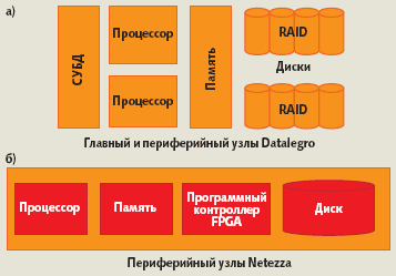 В машинах хранилищ данных используется либо массивно-параллельная, либо гибридная схема мультипроцессирования. Иерархическая архитектура машин NPS (рис. 2, б) компании Netezza получила название ассиметричная массивно-параллельнаях (Asymmetric Massively Parallel). На первом уровне располагается основной узел, мощный SMP-сервер, а на втором — десятки и сотни параллельно работающих миниатюрных периферийных узлов (Snippet Processing Unit, SPU). Компания DATAllegro применяет массивно-параллельную схему мультипроцессирования без разделения ресурсов (Ultra Shared Nothing). В ее специализированных устройствах (рис. 2, а) главный и периферийных узлы — это полнофункциональные двухпроцессорные серверы СУБД на базе процессоров Intel Xeon, каждый из которых оснащен 12 дисками Raptor производства Western Digital.
