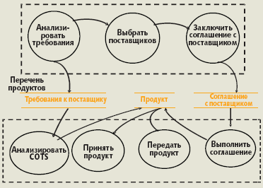 Область процессов «Управление поставщиками» включает в себя: определение типа приобретения; выбор поставщиков; заключение соглашений с поставщиками; анализ коммерчески доступных продуктов (Comercial-Of-The-Shelf, COTS); передачу продуктов в проект (см. схему).