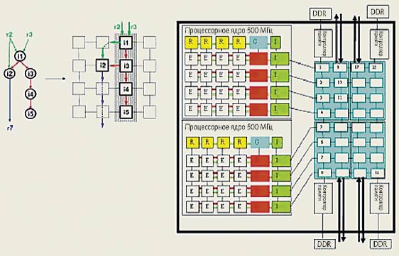 Кристалл TRIPS и пример отображения графа потоков данных программы в массив 4х4 АЛУ