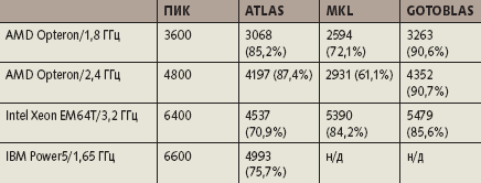 Однако эффективность HPL сильно зависит от реализации библиотеки BLAS (Basic Linear Algebra Solver). Наиболее известные реализации BLAS для современных микропроцессоров содержатся в библиотеках ATLAS, MKL и GotoBLAS. Посмотрим, насколько удается приблизиться к пиковой производительности тестируемых процессоров при использовании HPL с этими библиотеками (табл. 1). Во всех таблицах в скобках указан процент пиковой производительности процессора. В экспериментах с HPL задавалась матрица 15000x15000 элементов, близкая к максимальной матрице, которая целиком помещается в 2 Гбайт оперативной памяти.