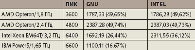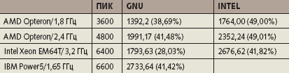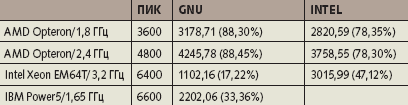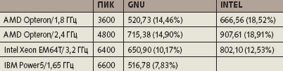 Применительно к процессорам AMD Opteron удалось подойти весьма близко к пиковой производительности. Intel Xeon EM64T может приблизиться к пиковой производительности при использовании команд из наборов SSE2 и SSE3, позволяющих выполнять операции над 128-битными данными, что при обработке данных двойной точности эквивалентно работе с двухкомпонентными векторами. В нашем случае можно вместо переменных FP* и GP* ввести массивы из двух элементов FP*(2), после чего задействовать инструкции векторизации по дополнительному измерению. Такое преобразование позволило получить на Xeon EM64T 3,2 ГГц производительность 4625,90 MFLOPS, что составляет 64,25% пиковой производительности.