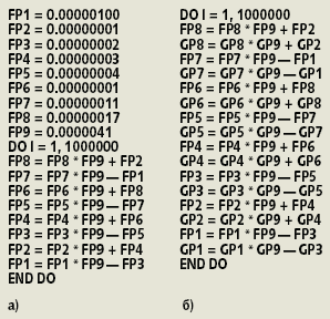 Даже при выполнении достаточно «хорошей» операции получаем лишь 15% пиковой производительности. Попытаемся добиться большего, заменив операцию над массивом скалярными операциями, операнды которых предположительно можно расположить на регистрах. Следующий фрагмент (рис. 1а) взят из [2]. В нем опять используются пары «сложение + умножение», а все данные потенциально могут быть расположены на регистрах (в табл. 3 указана производительность тестируемых процессоров в данном фрагменте).