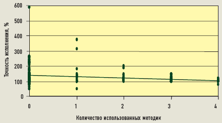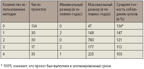В таблице представлены результаты анализа 246 проектов. В первом столбце показаны наша контрольная переменная — число использованных методик. Если в проекте применялась одна, две или три методики, мы не уточняли, какие именно из них, поскольку посчитали, что это не имеет значения (это мы обсудим позже). В применении четырех методик нет никакого порядка или взаимной зависимости. В последнем столбце указана зависимая переменная нашего исследования в виде средней точности соблюдения сроков — вполне приемлемая (в пределах 10% превышения) только в тех случаях, когда при выполнении проекта использовались три или четыре методики.
