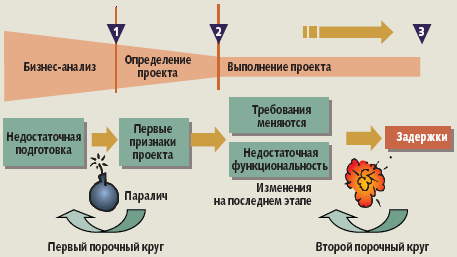 | Рис. 2. Недостаточно эффективные предварительные процессы вызывают паралич и требуют внесения изменений на последних этапах, что в конечном итоге приводит к срыву сроков выполнения проекта |