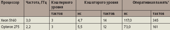 | Таблица 3. Задержки по результатам тестов lmbench. * Использованные типы памяти: FB-DIMM Registered DDR2-533 СAS4 для Xeon; DDR-400 (3-3-3-6) для Opteron. Измерения проведены в среде Linux 2.6.15. |