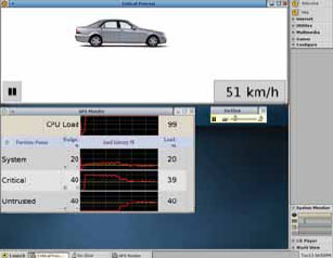 Теперь запустим те же приложения с адаптивной декомпозицией ресурсов. Создадим в системе три группы процессов: System с бюджетом 20% процессорного времени, Critical и Untrusted с бюджетом 40% процессорного времени каждый. Приложение Go-Slow запустим в группе Untrusted, критичное приложение Car запустим в группе Critical, а все остальные процессы и потоки будут работать в группе System. В результате приложение Go-Slow не использует процессорные ресурсы, а свободные ресурсы делятся между остальными двумя группами процессов, при этом процессор загружен на 100%. Если увеличить нагрузку на систему с помощью приложения Go-Slow, то, поскольку адаптивная декомпозиция гарантирует выделение процессорного времени группе приложений, приложению Go-Slow будут выделены ресурсы процессора в соответствии с установленным бюджетом. В связи с возросшей нагрузкой на систему и отсутствием свободных процессорных ресурсов, все группы приложений получают процессорные ресурсы согласно установленным бюджетам (рис. 5). Критичное приложение Car стало работать медленнее (скорость движения автомобиля упала), но все же оно работает и гарантированно получает выделенные ему ресурсы.
