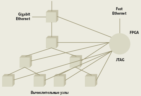 Управляющая сеть. BG/L, особенно в больших конфигурациях, имеет огромное число потенциальных объектов диагностики — микросхем, термических сенсоров, блоков питания, вентиляторов и т.д. Мониторинг всего этого хозяйства осуществляет хост, использующий каналы Fast Ethernet. Специальные FPGA-микросхемы конвертируют пакеты Ethernet в традиционные управляющие сети I2C и JTAG (рис. 4). JTAG используется для процедуры начальной загрузки и отладочного доступа ко всем узлам.