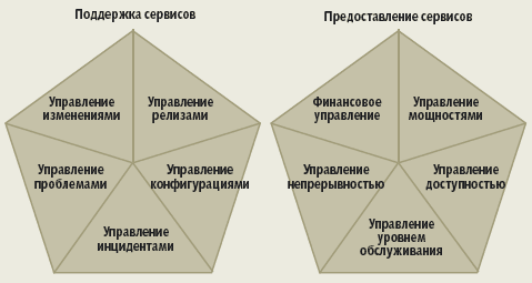 Процессы и сервисы — краеугольные камни модели ITIL. Согласно построенной на базе ITIL методологии управления ИТ-сервисами (IT Service Management, ITSM), ИТ-департамент превращается в сервисное подразделение, предоставляющее свои услуги бизнесу, и именно на такой основе строит свои взаимоотношения с бизнес-подразделениями компании. ИТ-сервисы складываются из различных традиционных функций ИТ: электронной почты, бизнес-приложений, печати, сетевой инфраструктуры, предоставления мощностей серверов и систем хранения и т.д., из действий персонала, использующего различное программное и аппаратное обеспечение.