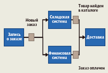 Однако, поскольку компьютерные системы становятся все более взаимосвязанными, возрастает количество публикуемых и воспринимаемых ими событий. Система обработки заказов может получать их с сайта в Internet или с помощью специального клиентского приложения и оповещать об этом другие системы. Система, ожидающая прихода нового заказа, может быть как финансовой системой, следящей за тем, оформлен заказ в кредит или оплачен с помощью кредитной карты, так и складской программой, проверяющей наличие заказанного товара в своем каталоге (рис. 1). Каждая из этих систем впоследствии может опубликовать любое другое событие для любой заинтересованной стороны. Наконец, система управления доставкой может ожидать сообщений типа: «Имеется в наличии» или «Оплачено», чтобы подготовить товар к отправке. Такой стиль взаимодействия, основанный на событиях, значительно отличается от традиционного командно-контролирующего стиля, при котором система обработки заказов должна сначала запросить складскую программу о наличии товара на складе, дождаться ее ответа, а затем послать финансовой системе запрос на проведение платежа. И только после того, как будет получен положительный ответ, она сможет дать системе доставки команду «отправить товар».