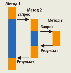 При взаимодействии, построенном на стеке вызовов (рис. 3), один метод вызывается другим, затем система дожидается результата и продолжает работу согласно дальнейшим инструкциям. Такое поведение системы можно охарактеризовать тремя главными особенностями: согласованность, непрерывность и сохранение контекста. Согласованность обеспечивает синхронизацию выполнения программы, т.е. вызывающий метод должен дождаться результатов вызова и только затем продолжить работу. Непрерывность гарантирует, что по завершении работы вызываемого метода выполнение программы продолжится со строки, следующей за сделанным вызовом. И наконец, стек вызовов хранит локальные переменные как часть контекста выполнения: как только заканчивается вызов метода, исходный контекст вызывающего метода восстанавливается.
