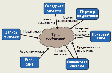 Но на этом история события не заканчивается. Складская программа может обнаружить, что на складе не хватает товаров, и оповестить об этом другие системы, например систему обеспечения поставок. Если срок действия кредитной карты покупателя подходит к концу, нас могут известить об этом, и мы должны будем послать покупателю по электронной почте письмо с просьбой прислать номер новой кредитной карты. Список интересных событий становится все длиннее. Для описания такого явления — массового обмена сообщениями между многими системами — Дэвид Лукхэм [1] ввел термин «туча сообщений» (Event Cloud, рис. 2).