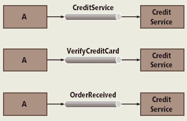 При простейшем подходе для каждого компонента отводится отдельный канал. Например, компонент, отвечающий за подтверждение подлинности кредитных карт, можно назвать CreditService и заставить реагировать на сообщения, приходящие по каналу с тем же названием. Если какому-либо компоненту понадобится что-либо, связанное с кредитом, он может отправить сообщение по этому каналу. В то время как канал обеспечивает нам некоторую изоляцию на уровне реализации (можно заменить одну реализацию кредитного сервиса на другую без предупреждения, совершенно незаметно), семантика взаимодействия не сильно меняется. Вызывающий метод по-прежнему должен знать, какой компонент обеспечивает требуемую функциональность, что весьма напоминает сценарий действий при использовании стека вызовов.