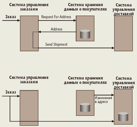 Системы, управляемые событиями, работают по-другому, почти противоположным образом. Некоторые из них не запрашивают данные у других систем, а хранят свои собственные копии данных и отслеживают обновления по мере их появления. В нашем примере это может означать, что система управления доставкой хранит свою собственную копию массива адресов покупателей, а когда приходит заказ, она может использовать указанный в нем адрес как метку при доставке, не обращаясь к системе хранения данных о покупателях. Хотя такой способ репликации данных и может показаться опасным, он имеет свои преимущества. Система хранения данных о покупателях просто рассылает информацию об изменениях, при этом ей не нужно знать, у кого имеется копия. Поскольку система хранения данных о покупателях не получает запросов об адресах клиентов, ситуация «бутылочного горла» не наступит никогда, даже если система вырастет и потребует увеличения числа адресов.