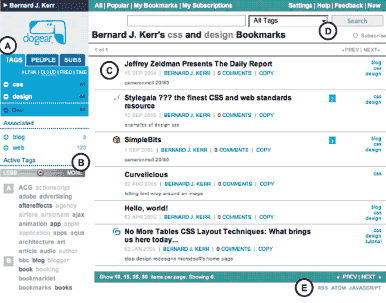 На первой странице системы (рис. 1) выводятся закладки, недавно добавленные пользователем. В левой части экрана (A) размещены: ссылка на пользовательские теги; список людей, которые сделали закладки на те же самые URL; список персональных подписок пользователя. В области Active Tags (B) перечисляются теги, причем число показанных тегов можно варьировать в зависимости от частоты их появления. В центре экрана помещен список закладок (С). Каждая закладка содержит название, возможно, некое описание, теги, дату создания и информацию об авторе. Указав на название закладки, можно перейти на соответствующий сайт; указав на тег — перейти на список других закладок, помеченных автором тем же ключевым словом; указав на имя автора — перейти на список его закладок. Поисковый механизм Dogear (D) позволяет искать закладки по тегу, персоналии или типу набора закладок. Любую страницу в Dogear можно просматривать в формате RSS или Atom и встраивать с помощью JavaScript в другую Web-страницу (E).