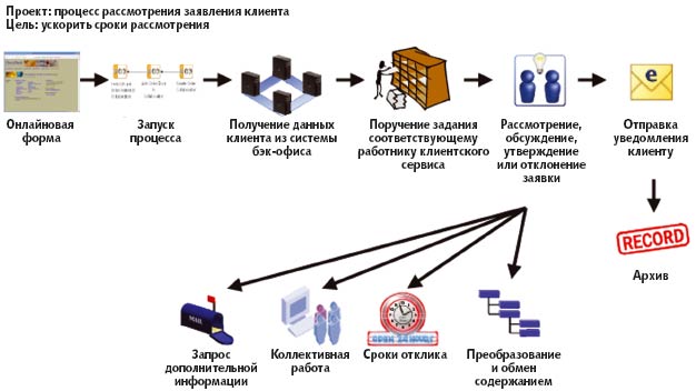 К комплексным BPM-решениям относится и EMC Documentum Process Suite. Директор по развитию бизнеса компании EMC Software Владимир Прожогин привел пример автоматизации бизнес-процесса обработки заявления клиента. Система электронных форм Forms Builder связывается с Business Process Manager для запуска процесса. Обращение посредством Web-сервисов к системе бэк-офиса компании позволяет извлечь из соответствующей базы данные о клиенте, на основе которых формируется задание сотрудникам клиентского сервиса. На следующих этапах процесса система поддерживает коллективное рассмотрение, отклонение или утверждение заявки и отправку уведомления клиенту (рис. 2). Реализации такого процесса предшествует идентификация, обследование и анализ процессов «как есть» и моделирование процесса «как должно быть».