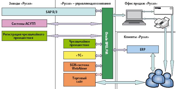 Рынок BPM в России пока находится в стадии становления, и примеров успешных внедрений немного; так или иначе, желающих поделиться своим положительным опытом почти нет. Тем ценнее оказалась возможность познакомиться на конференции с проектами компаний «ГВЦ Энергетики» и «Русал». Как рассказал Роман Будник, начальник отдела прикладных информационных систем компании «Русал», в результате нескольких последовательных проектов на базе системы Oracle BPEL Manager в компании была осуществлена интеграция систем управления бизнесом на базе продуктов SAP R/3 и «1C», АСУТП, системы регистрации происшествий на заводах, торгового сайта, офиса продаж компании, а также ERP-решений клиентов «Русала» (рис. 3). В итоге удалось добиться повышения производительности труда пользователей информационных систем на 30% и вдвое снизить нагрузку на разработчиков, обеспечить оперативное реагирование на изменения в бизнесе, предельно сократить сроки реализации новых запросов бизнес-пользователей.