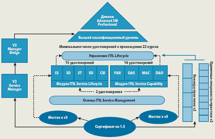 В новой версии особое внимание уделено модифицированной квалификационной схеме, по которой проводится сертификация на всех уровнях обучения ITIL. Эта схема охватывает все составляющие описанных выше моделей. К примеру, структура курсов, предлагаемых компанией HP, выглядит так, как показано на рис. 5.