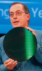 Глава корпорации Intel Пол Отеллини, выступая с докладом на конференции Intel Developer Forum, продемонстрировал 300-миллиметровую кремниевую основу, изготовленную по экспериментальной пока технологии 32 нм. Топологический размер элемента процессоров в Intel собираются уменьшить до этой цифры в 2009 году. По словам Отеллини, 32-нанометровый чип будет содержать свыше 1,9 млрд. транзисторов, а его быстродействие «позволит вывести графику и развлечения на уровень жизненного реализма». Сегодня процессоры Intel выпускаются по технологии 65 нм, а выходящий в ноябре чип под кодовым именем Penryn будет уже 45-нанометровым. Затем до перехода на 32 нм появятся еще процессоры под кодовыми именами Silverthorne и Nehalem.