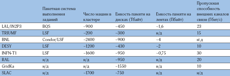 Из таблицы виден масштаб некоторых кластеров уровня Тier 1 или T1 (деление кластеров, принятое в вычислительных распределенных grid-структурах для физики высоких энергий), хотя в ней упоминается не более трети кластеров уровня Т1, которые планируются к использованию для обработки данных с ускорителя в ЦЕРН. Все кластеры имеют необходимое программное обеспечение для поддержки распределенных вычислений, программный инструментарий Globus и VDT (Virtual Data Toolkit, vdt.cs.wisc.edu) и массу дополнительных программ для реализации архитектуры grid.