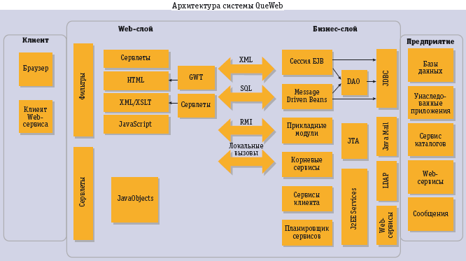 QueWeb реализован в трехзвенной распределенной архитектуре, включающей уровень данных, уровень бизнес-логики и тонкого клиента.