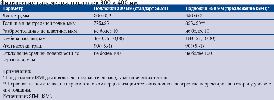 Первый шаг на пути внедрения стандарта 450 мм — механические испытания подложек на надежность и совместимость с устройствами и механизмами транспортировки, а также симуляционные тесты с различным производственным оборудованием (без применения к подложкам реальных операций технологического процесса изготовления микросхем). Для этого в ISMI предложили использовать тестовые подложки, в основном с теми же геометрическими характеристиками, что зафиксированы в стандарте SEMI для подложек диаметром 300 мм, за исключением толщины. С первоначальной оценкой толщины (825 микрон), вероятнее всего, придется расстаться как минимум на данном этапе, хотя это и утяжелит подложки, и сделает их дороже. По словам представителей ISMI, утолщение до 1 мм снизит риск поломок при проведении механических тестов, в чем в первую очередь заинтересованы производители подложек. В дальнейшем, в ISMI полагают, что толщина будет все же уменьшаться. До какого значения? Этот вопрос пока остается открытым. Например, научный сотрудник Intel Майк Голдстайн, возглавляющий разработку технических требований к тестовым подложкам диаметром 450 мм в рамках рабочей группы при профильном комитете SEMI, заявил некоторое время назад, что он считает оптимальной толщину 925 микрон.