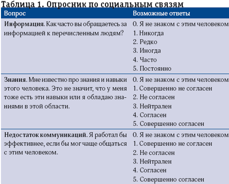 В ходе сетевого анализа было проведено анкетирование, где всем участникам команды предлагалось указать до 20 сотрудников, к которым они обращаются за важной информацией, необходимой для выполнения своей работы, или за помощью, когда обдумывают сложные рабочие проблемы. Кроме того, отмечались режим и форма общения, а также статус сотрудника: постоянно, эпизодически, удаленно или лично; сотрудники работают в организации, либо это клиенты, коллеги из других компаний или из других филиалов, друзья, члены семьи и т.д. Для каждого из этих людей нужно было ответить на вопросы, приведенные после таблицы. Кроме того, требовалось отметить, как долго осуществлялось знакомство, и иерархический уровень сотрудника. Затем, согласно опроснику из Таблицы 1, были заданы три вопроса о социальных связях каждого сотрудника.