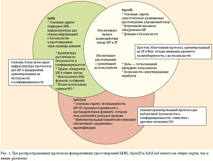 Сегодня широкое распространение получили три протокола для реализации различных аспектов федеративных удостоверений: SAML (Security Assertion Markup Language), OpenID и спецификация Identity Selector Interoperability Profile (часто именуемая как InfoCard), служащая основой для компонента Windows Cardspace. Из них SAML — наиболее зрелая и всеобъемлющая технология, варианты которой были стандартизованы в 2002-м и 2005 годах. OpenID появился в 2005 году, сейчас он представлен вторым поколением и продолжает активно развиваться. Протокол Cardspace появился позже, и его поддерживает компания Microsoft. На рис. 1 представлены общие черты и различия протоколов.