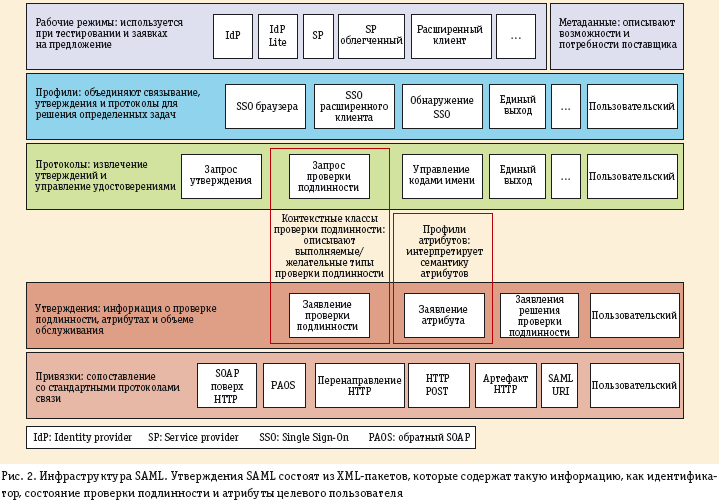 Как показано на рис. 2, ядро SAML состоит из «утверждений» (assertion), то есть XML-пакетов, составленных из идентификатора держателя удостоверения, состояния проверки подлинности и атрибутов. Утверждения и сообщения протокола можно подписывать, шифровать и объединять в профили.