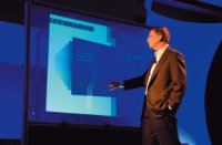 Принцип действия интерактивной стены Touch Wall, продолжающей линейку сенсорных устройств вывода информации, начатую «чайным столиком» Microsoft Surface, прост. Изображение проецируется на особый экран с тремя инфракрасными сенсорами и инфракрасной камерой в нижней его части; информация с сенсоров и камеры поступает в анализирующий блок, который, реагируя на нажатия на экран и даже на жесты пользователя, соответствующим образом меняет картинку. В основе анализирующего блока лежит программный инструментарий Microsoft Plex, приспособленный к работе с документами офисных приложений и проведению презентаций.