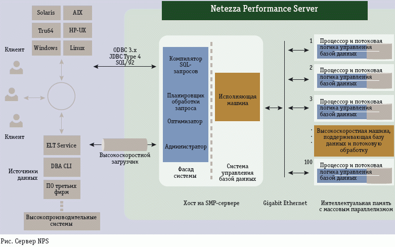 Специализированные серверы Netezza Performance Server (NPS) имеют двухуровневую архитектуру. Верхний уровень— хост, в качестве которого используется SMP-сервер, работающий под управлением Linux, нижний уровень— сотни лезвий Snippet Processing Unit (SPU), образующих кластер. Задача хоста— преобразовывать пользовательские запросы в лоскутные SPU и возвращать результаты пользователям. Каждый из SPU ответственен за выполнение своего лоскутка работы, то есть отдельной части запроса. Для этого он укомплектован центральным процессором, памятью, диском и матрицей FPGA, фильтрующей поток и выполняющей до 90% функциональной нагрузки, выпадающей на SPU. При поступлении входного запроса хост вырабатывает план его обработки, выделяя те части, которые выполняются на нем самом и передаются для параллельной обработки в стек SPU. Порция задания, передаваемая в SPU, состоит из кода, адресованного его центральному процессору, и набора параметров для FPGA, определяющих то, как следует фильтровать и обрабатывать потоковые данные. По окончании обработки хост собирает лоскутные результаты в единый ответ на запрос. Эта схема реализует тезис о приближении обработки к данным, сформулированный выше. По мере развития технологий глубина обработки возрастала, сначала были приближены собственно запросы (queries to the data), а на следующем этапе к данным приблизилась аналитика (analytics to the data). Это стало возможным за счет переноса для исполнения в SPU сложных алгоритмов, «выходящих за пределы SQL» (non-SQL).