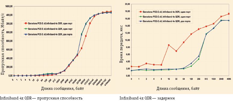 Сеть QDR имеет дуплексную пропускную способность 4 Гбайт/с, а имеющийся на плате Supermicro AS-1041M-T2 интерфейс PCI-E 8x — 2 Гбайт/с. Таким образом, подключение такой быстрой сети к медленному интерфейсу изначально странно, и здесь заведомо нельзя было получить более высоких характеристик при передаче длинных сообщений, чем позволяет интерфейс PCI-E 8x. Тем не менее некоторые результаты оказались неожиданными.