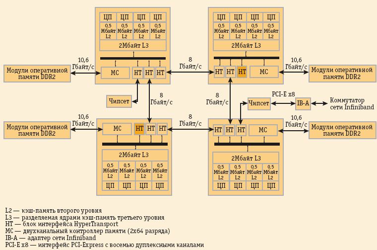 Суперкластер Barcelona состоит из четырех узлов, объединенных сетью Infiniband 4X DDR и размещенных на плате Supermicro AS-1041M-T2 (рис. 1). Каждый узел содержит четыре четырехъядерных процессора AMD Opteron 8350 (Barcelona) и 16 Гбайт оперативной памяти (возможна установка 64 Гбайт).